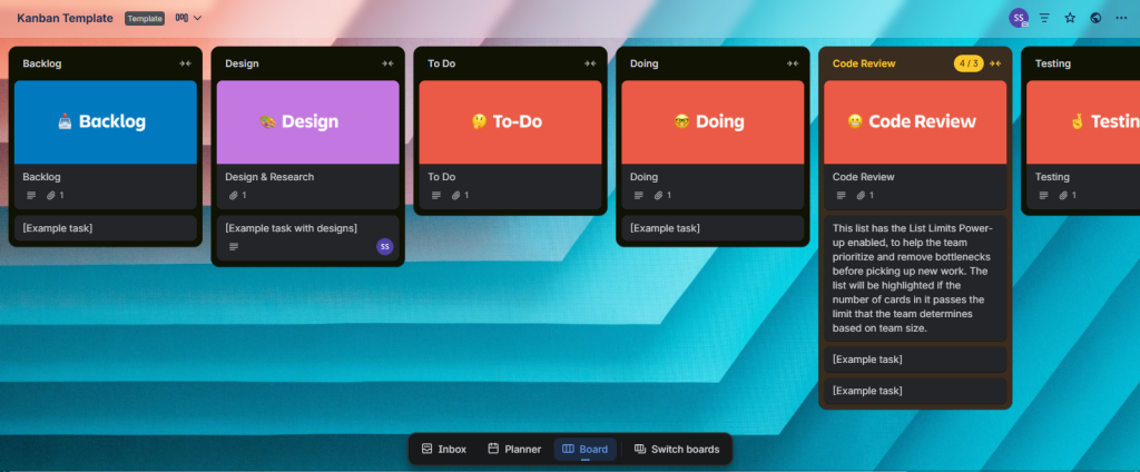 The Trello system is a card-based digital visual board that allows you to organize tasks visually in a card format, with multiple options for customization using Power-Ups (features that can extend the base functionality of Trello). Trello also allows users to enforce very basic WIP limits using one or more of the Power-Up features.